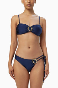 Crest is a bandeau-style bikini elevated with a custom gold ring at the center. Featuring gathering details creating a flattering ruched effect that enhances the natural shape. Removable shoulder straps offer styling versatility and added support, making it ideal for sun-soaked lounging or elevated resort evenings. Crafted in high-quality stretch fabric and fully lined for comfort, this piece blends elegance with practicality.