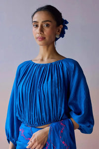Handspun in Malda silk, the blouse features ruching at the front and back, with an elasticated waist and sleeve hems for ease and comfort. Raglan sleeves add graceful movement, while a back keyhole opening completes the design with subtle sophistication.
