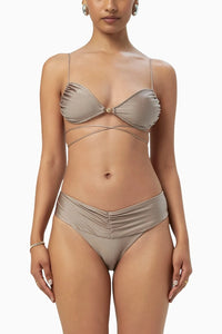 Barely there, impossibly bold. The Mistral bikini top is softly structured with adjustable ties for a graceful lift and personalised fit. Designed for the modern muse with an eye for subtle statement, this piece features sleek triangle cups and ruching details that flatters the form with elegant ease. A delicate gold-tone embellishment at the center adds a hint of glamour.