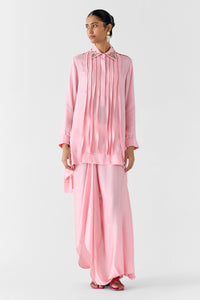 The Moonstone Asymmetric Shirt & Knot skirt crafted from our stunning viscose rapier fabrication, trans-seasonal, is a statement piece. This shirt, hand dyed in our moonstone pink, has an asymmetric fit. It has an embroidered collar and frills on the front. It has ruched sleeves and pearl detailing. It is paired with our knot skirt with a side zipper. Wear it with heels for an elegant look.