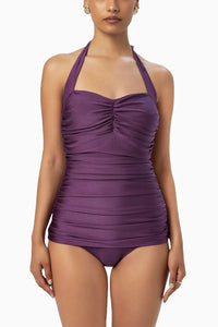 An ode to timeless vintage glamour, this retro halter one-piece swimsuit is designed to flatter with elegance and ease. With gentle all-over ruching, a softly curved neckline, and a halter tie that leaves the back open and unbound, this one-piece offers both structure and softness.