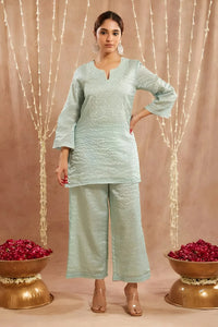 Fabric- Kurta- Crushed Tissue, Pant- Crushed Tissue Color- Aqua Blue Fit- Regular Components- 2 Product Code- SVENEROGMLKS13