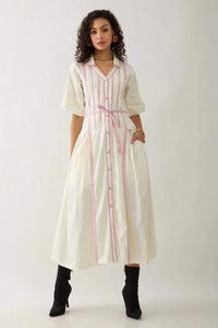 Fabric- Cotton Satin Color- Off White, Orchid Mosiac Fit- Fit And Flared Components- 1 Product Code- SVESNOBSN-DR-MOR-MO-01