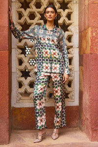 This stylish set features a geometric print inspired by traditional Moroccan mosaics, adding a unique, artistic touch. Crafted from soft, breathable organic viscose, the concealed placket shirt with full sleeves offers comfort and elegance. The matching straight pants feature hook/eye and zip closure, belt loops at the waist, and convenient side pockets, creating a chic, coordinated look for any occasion.