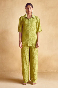 A soft statement in moss green—our coord set features a relaxed half-placket shirt and wide-leg pants, crafted in a tonal jacquard that whispers floral textures. Breezy yet sculpted, the silhouette flows effortlessly while maintaining form. Finished with a pop collar and fluid movement, this set brings understated elegance to warm-weather dressing.