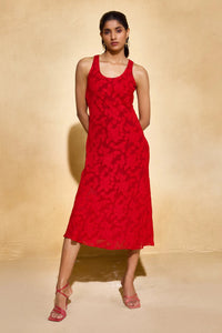 A bold silhouette in bloom. Crafted in a vivid red floral jacquard, this midi-length dress skims the body with fluid elegance. The scoop neckline and sleeveless cut keep it modern and minimal, while the rich texture adds depth and dimension. Designed to transition seamlessly from daytime ease to evening edge.
