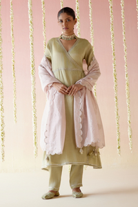 This refined three-piece set includes an Angrakha, Pant, and Dupatta. The Angrakha is adorned with delicate aari work along the edges, offering a touch of elegance. It pairs perfectly with narrow pants featuring lace details. Crafted from fine, luxurious fabric, this set ensures all-day comfort and timeless style.