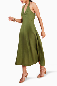 Constructed using an eco-friendly fabric, this halter midi dress is an easy and chic addition to your summer wardrobe. It features gold detailing and ruching, which makes it perfect for a summer soiree. Style it with strappy sandals for maximum impact.