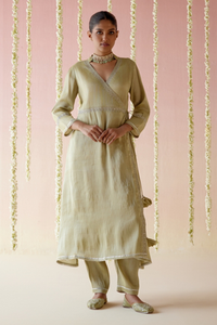 This elegant two-piece set includes an Angrakha and Pant, complemented by a coordinating Dupatta. The Angrakha features delicate aari work along the edges, paired beautifully with narrow pants. The matching Dupatta completes the ensemble, offering a sophisticated and polished look.