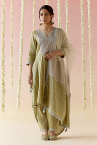 Fabric- Kurta: Tissue, Pant: Tissue, Dupatta: Satka Net Color- Moss Pearl Components- 3 Product Code- SVENEROGMKSD10