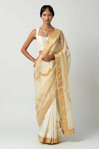 A signature Ohfab creation, this half-and-half saree combines the richness of handwoven pachranga silk with the delicacy of organza. The silk drape is adorned with intricate woven bootis – a hallmark of Ohfab’s craftsmanship – while the organza pallu features fine tissue applique in the shape of Mughal arches.
