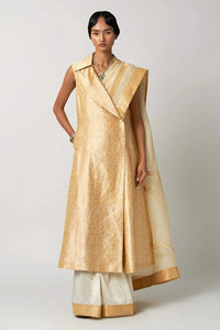 Paired with the Gold Empress Coat, the ensemble transforms into a statement of regal modernity. This sleeveless long brocade jacket is handwoven in rich brocade, combining traditional weaving techniques with the clean lines of a trench-inspired silhouette. Its versatile design makes it the perfect layering piece, draped over a saree for a majestic festive look or styled with contemporary separates for an Indo-Western aesthetic.