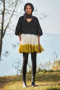 This one-of-a-kind lime and black dip-dyed skater dress is a striking piece from the Autumn/Winter collection. Featuring voluminous sleeves with elasticated finishes for added comfort and ease, this handcrafted dress showcases the intricate art of shibori dyeing, giving it a unique, handcrafted look. Fully lined for added structure and comfort, it offers both style and wearability, making it a standout addition to your wardrobe.