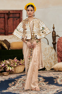 Beige Saree with mirror work border styled with a full mirror work bolero cape on gota lined with chanderi silk.