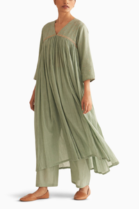 Featuring a light green kurta in cotton base with resham and zari work on sleeves and yoke.