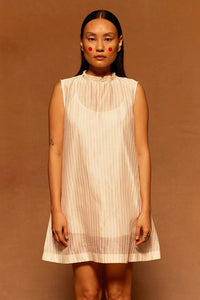 The Mu-I Shift Dress exudes effortless charm with itsgathered neckline, soft striped pattern, and relaxedhemline. Crafted from lightweight chanderi fabric, thisdress offers a breezy, comfortable fit perfect for warmweather. Its simplicity and understated elegance makeit a versatile piece, ideal for casual outings or summergatherings, embracing ease and sophistication in everywear.