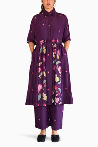 Featuring an effortless ensemble for your everyday wear, this collared shirt kurta in Russian violet color is tailored in chanderi silk. It’s fitted at the waist and flared at the bottom, and comes with side pockets. The kurta is adorned with beautifully handcrafted beaded buttons. A companion for days and evenings, this kurta comes with elegant floral-printed chanderi pants to complete the look.