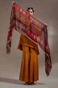 Featuring the Multi Anka Patti Odhni by Aseem Kapoor’s ANKA collection. This tribal motif printed dupatta is adorned with fabric tassel details and a decorative border, adding a stylish and traditional touch to any ensemble.