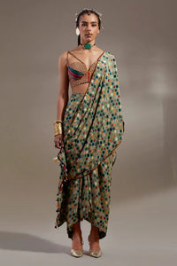 Featuring the Multi Anka Soma Draped Sari with Kama Blouse by Aseem Kapoor’s ANKA collection. This body-fitted saree set showcases a geometrical pattern blouse with M.O.P. and beadwork details, paired with a printed draped saree featuring a stylish waistband.