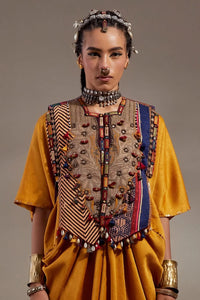 Featuring the Multi Anka Zuri Gilet by Aseem Kapoor’s ANKA collection. This free-size, anti-fit embroidered gilet features tribal tassels, resham thread embroidery, beadwork, and a highlighted tribal yoke, with no armholes and side laces for a unique fit.