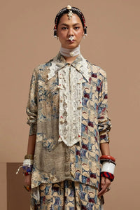 Featuring the Multi Basque Atri Straight Shirt by Aseem Kapoor's Basque Collection. Crafted in printed crepe, this easy-fit shirt showcases a relaxed silhouette with intricate lace-embroidered collar and yoke detailing perfect for effortless, statement-making style.