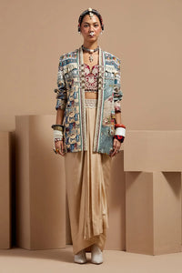 Featuring the Multi Basque Blouse With Drape Skirt and Open Dhana Jacket by Aseem Kapoor's Basque Collection. This luxurious co-ord set includes an embroidered body-fitted blouse, paired with a pleated, waist-elasticated drape skirt and an open, structured jacket. Adorned with resham thread embroidery, M.O.P. beads, and tassel details, the ensemble combines a fitted blouse, relaxed skirt, and relaxed jacket for a balanced, sophisticated look.