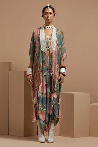Featuring the Multi Basque Corset Blouse With Drape Pants and Veni Dupatta Jacket by Aseem Kapoor's Basque Collection. This striking co-ord set includes a geometrically designed, full embroidered corset blouse, paired with printed draped trousers. The printed embroidered veni dupatta jacket adds a bold, intricate touch. Adorned with resham thread embroidery, M.O.P. beads, and tassel details, the blouse offers a body-fitted silhouette, while the trousers feature a relaxed fit with a waist-elasticated design, and the jacket completes the look in an anti-fit style for a sophisticated and contemporary flair.