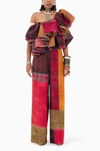 Featuring Multi Beyond Ken Roxanna Ruffle Top and Pants Set. Aseem Kapoor's ensemble in vibrant Multi color. The anti-fit Ruffle Top, crafted from Crinkle Crepe with Black and White bead detailing, is flawlessly paired with comfortable Korean Pants in Crinkle Crepe and Slub Satin. This Beyond Ken set effortlessly combines contemporary style with artistic embellishments.