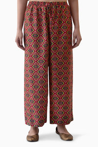 Drokpa pyjama in multi Habutai silk, featuring a vibrant red digital print. A hand-hemmed indigo shantoon facing completes the hem, offering clean contrast and modern flair to the lively silhouette.
