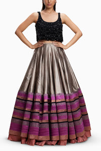 Discover modern elegance with our black blouse, enhanced by crystalized tassels, paired with a skirt boasting a stunning multi-colored pin-tuck border. This meticulously designed ensemble blends traditional charm with contemporary flair, making it perfect for any glamorous occasion.