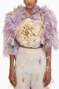 This cropped jacket is a stunning statement piece, meticulously handcrafted from luxurious, multi-colored feathers. The vibrant hues and delicate texture create a visually striking effect, making it a perfect blend of opulence and artistic craftsmanship. The unique design, with its cropped silhouette, offers a modern and bold twist, elevating any outfit with a touch of whimsical elegance. Ideal for those who seek to make a statement, this feathered jacket combines luxury and individuality in one exquisite piece.