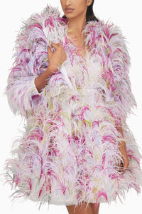 This stunning mini dress is adorned by delicate multi coloured feathers all over and is paired with a velvet belt.This stunning mini dress is adorned by delicate multi coloured feathers all over and is paired with a velvet belt.