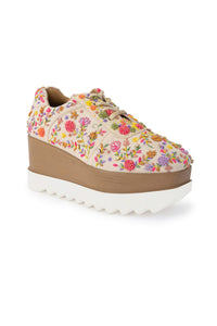 A hand-plucked design for the ones who find joy in the freshest blooms. Dainty like a daisy, royal like a rose; wearing The Corsage wedge sneakers feels like a stroll in a floral paradise. The picturesque colours of this design represent the vibrancy each guest brings to a grand Indian celebration. Our signature silhouette of a sneaker with a wedge heel is decorated with silk threads, sequins, and coloured crystals on moss crepe fabric. Let this corsage be your souvenir of a joyous day worth remembering for years to come.