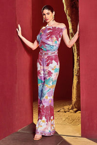 Showstopping and sleek, this one-shoulder sequin jumpsuit features a backless design, flare at the bottom, and a chic buckle detail.