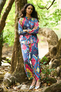 Featuring a relaxed-fit shirt in a bold multicolour large-scale Ikat print, this set is crafted from breathable, textured organic viscose. The shirt includes a band collar, button-down placket, full sleeves with buttoned cuffs, and a back box pleat for added ease. Paired with straight-fit pants in the same striking print, designed with a fully elasticated waistband, side pleat detailing at the cuffs, and functional side pockets for everyday comfort and style.
