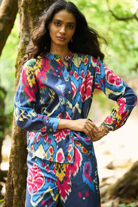 Featuring a relaxed-fit silhouette, this shirt showcases a bold multicolour large-scale Ikat print on breathable, textured organic viscose. Designed with a band collar, button-down placket, and full sleeves with buttoned cuffs, it’s finished with a back box pleat for added ease and movement.