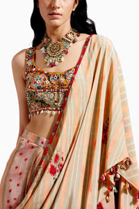 Introducing the Multi Kalpa blouse, exquisitely crafted from Chanderi fabric. Its slim fit silhouette is adorned with Resham thread embroidery, kaudi latkan embellishments, and elegant back ties.