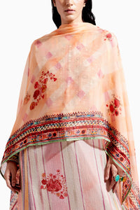 Featuring the Multi Kinara Odhni - a printed sheer silk dupatta that adds elegance to any ensemble. Complete with charming tassel details for a touch of flair.