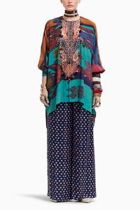 Featuring the Multi Kuru Trapeze Kurta and Trousers by Aseem Kapoor from Beyond Ken-3 Collection. This ensemble pairs a printed trapeze kurta with an embroidered yoke with printed trousers. Adorned with Resham thread highlighting, embroidery, cowrie shells, beads, and tassel details, the kurta offers an easy fit and comfort. The elasticated waist trousers ensure versatility and a flattering silhouette, making it perfect for blending cultural elegance with modern style.