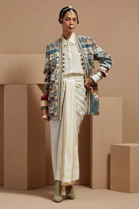 Featuring the Multi Mogra Basque Shirt With Skirt and Open Dhana Jacket by Aseem Kapoor's Basque Collection. This elegant co-ord set includes a classic straight shirt paired with a pleated skirt, complemented by a heavily embroidered open jacket with tribal detailing and an AK brand button. Adorned with resham thread, cowri shells, beads, and thread tassel details, the set offers a relaxed fit shirt, elasticated pleated skirt, and a structured jacket for a refined, stylish look.