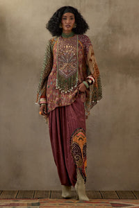 Featuring the Multi Mural Mariyam Kurta with Drape Trouser Set by Aseem Kapoor from the Mural Collection. This set includes a printed kurta with cape sleeves, tasseled yoke, and intricate resham thread embroidery, cowri shells, M.O.P. beads, and tassel details, paired with printed draped trousers. The kurta is crafted from sheer silk and natural crepe, and the trousers from natural crepe, both offering a relaxed fit. Slight variation in print may occur.