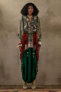 The Multi Mural Mitra Short Kurta-Jacket Set features a printed, highlighted, relaxed-fit short kurti with inserts, paired with printed draped trousers and a matching dupatta jacket. Adorned with resham thread embroidery, cowri shells, M.O.P. beads, and tassel details, this set offers an easy-fit kurta, elasticated waist trousers, and a relaxed fit for effortless style and comfort.