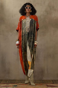 The Multi Mural Vayu Kaftaan Jumpsuit is a free-size printed jumpsuit with an embroidered yoke, tassel details, and a metal zipper back opening. Featuring resham thread mirror work embroidery, cowri shells, and fabric tassels, this anti-fit design offers a relaxed silhouette with no armholes and a drawstring for added comfort and style.