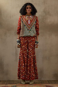 The Multi Mural Zahra Sweatshirt Jacket Set features a printed and embroidered sweatshirt with a metal zipper opening at the back, paired with printed straight trousers. Adorned with resham thread embroidery, cowri shells, beads, and thread tassel details, this set offers an easy-fit jacket and relaxed-fit trousers for a stylish and comfortable ensemble.