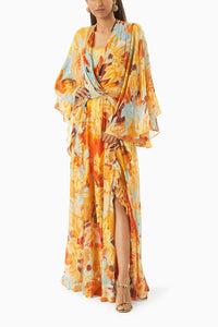 Add a splash of colour and pattern to your daytime with this ultra-feminine silhouette flattering dress. Crafted in luxurious lurex georgette long dress with a cowled neckline, printed yoke & front slits bottom with frills. It is a very comfortable to wear and it's an easy top to style from day to night.