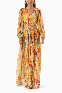 Mandira Wirk's dress showcases a soft palette and feminine details. Its flattering lurex georgette fabric is stamped with a beautiful pattern and details cut out style on the waist and ruffle details. Complement the structured detailing with contemporary accessories.