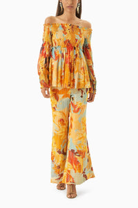 Make an eclectic style statement in this floral printed co-ord set. It is cut in printed lurex georgette fabric detailed in off shoulder neckline with smocking and the pants fall straight with a flare. Style this pant suit with a pair of high heels & statement earrings.
