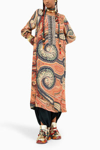 Featuring Multi Rudra Kurta with Drape Trouser Set, crafted from natural crepe. The anti-fit, Ambi print long kurta boasts intricate detailing in front, complemented by relaxed-fit drape trousers adorned with exquisite sequence and bead work. It's a perfect blend of style and comfort.