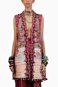 Introducing the Multi Ruhi Sleeveless Jacket. Crafted from cotton khadi, its relaxed fit offers comfort. Adorned with a graphic tribal embroidery and textured print for a unique touch.