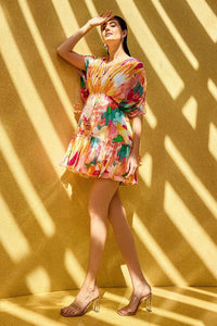 Elevate your style with this short dress, featuring a gathered two-tiered mini skirt, kimono sleeves, and tassel accents. A graceful look for relaxed, sun-soaked days.